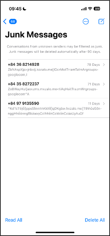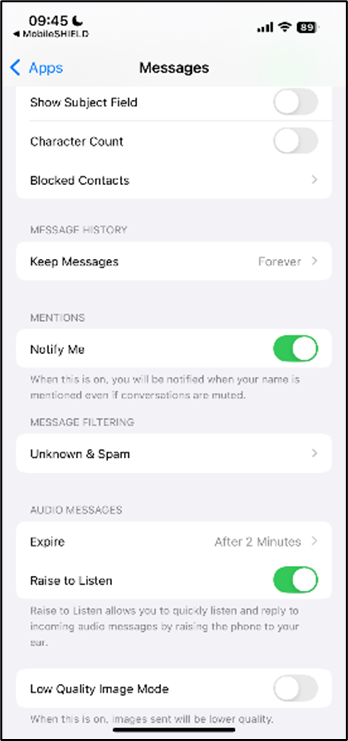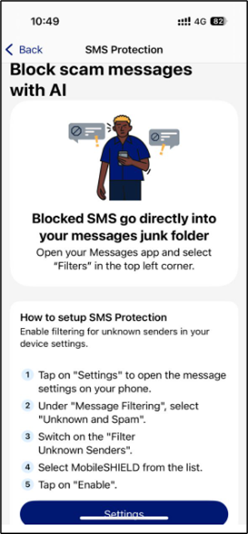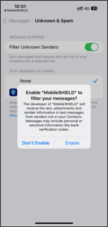 Step 2: Enable access for SMS Protection After tap ‘Setting’ Go to ‘Unknown & Spam’ in Message Filtering section Tap ‘Enable’ Select ‘MobileSHIELD’ and toggle on ‘Text Message Filtering’