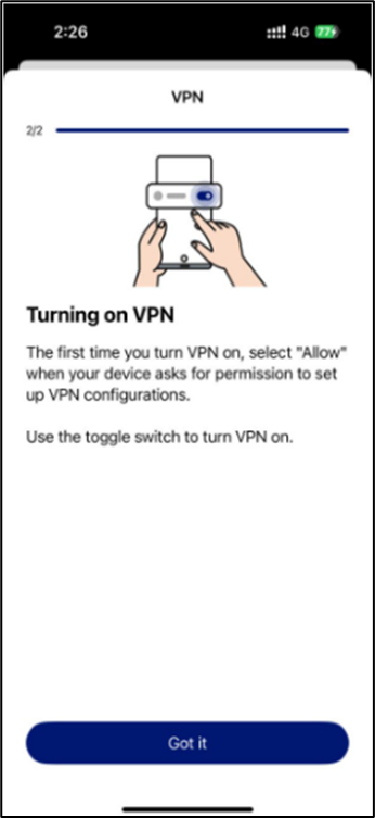 Steps: Go to ‘ VPN’ Set up required Tap on ‘Continue’ Turning on VPN than tap ‘Got it’ Turn on to set up toggle ‘Best location’ Your privacy is protected