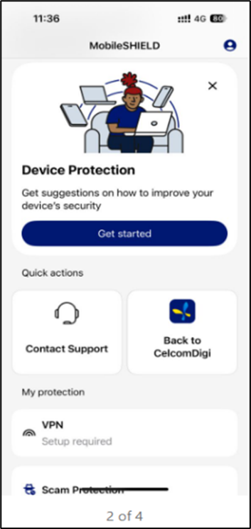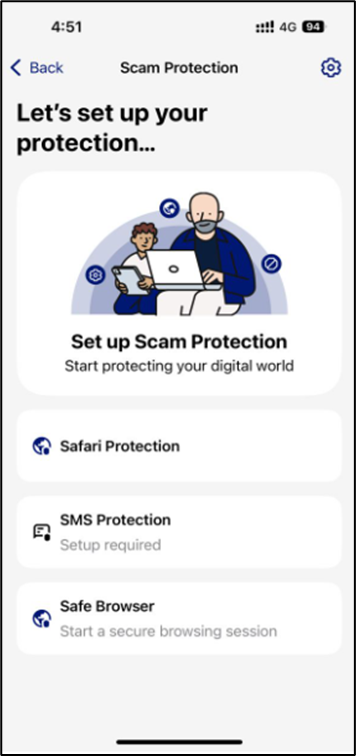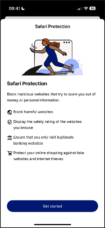 Step 1: Get started on Safari Protection Select ‘Scam Protection’ Then tap ‘Get started’ Tap on ‘Safari Protection’