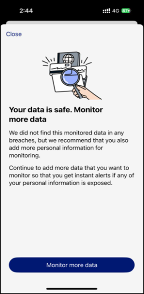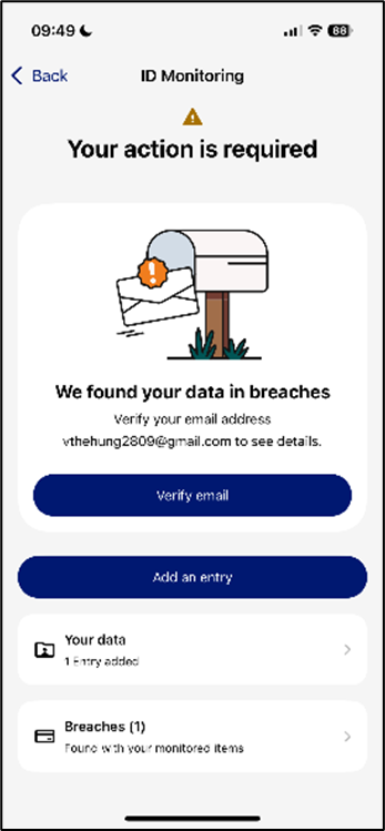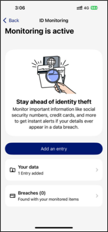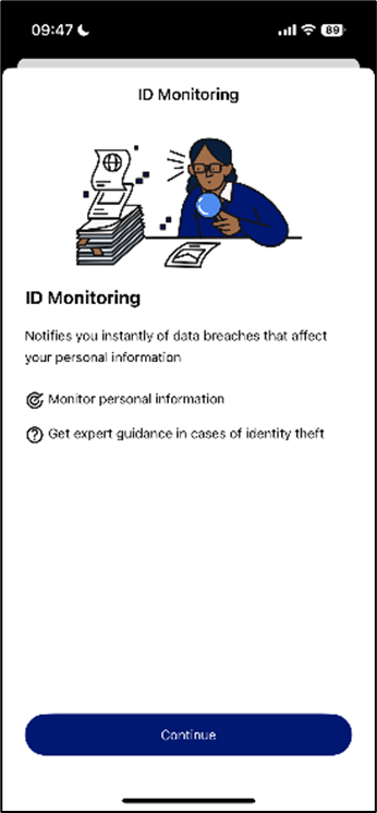 Step 1: Add email Select ‘ID Monitoring’ Tap ‘Continue’ Tap ‘ add email’ Input email and tap ‘Save’ Tap continue