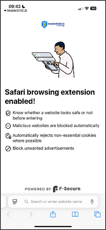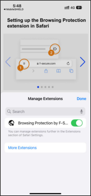 Step 2: Enable Access for Safari Protection Tap ‘Set up’ Then tap on ‘Get started’ Tap ‘Always Allow’ access for Safari Protection (including banking and shopping protection) Manage Extensions & ‘enable browsing Protection by F Secure’ Safari browsing extension enabled! Your browsing on Safari is now protected