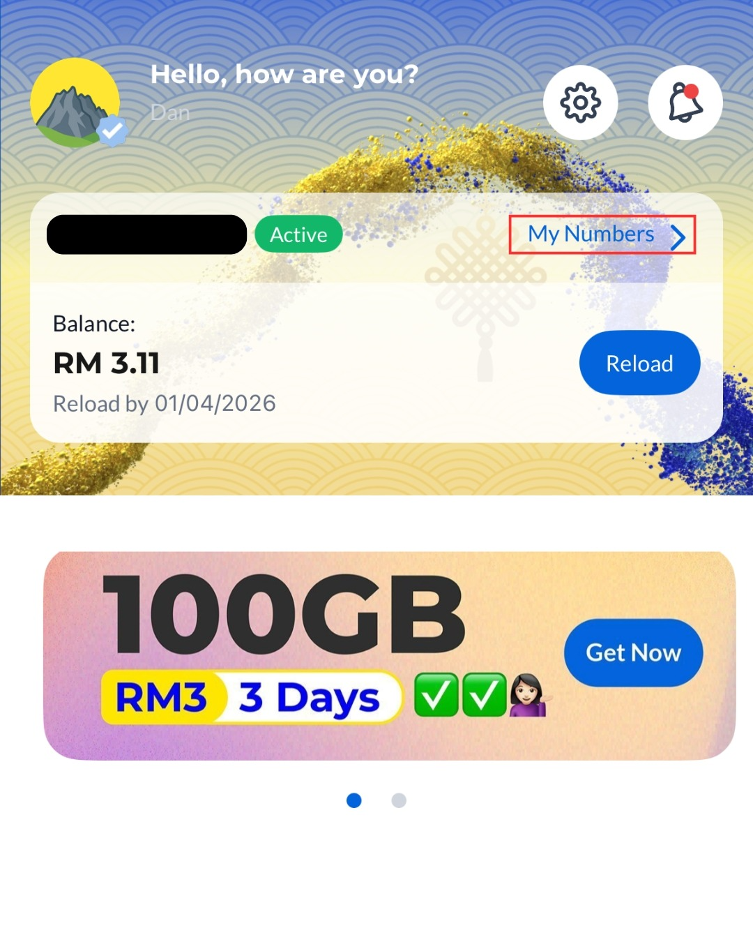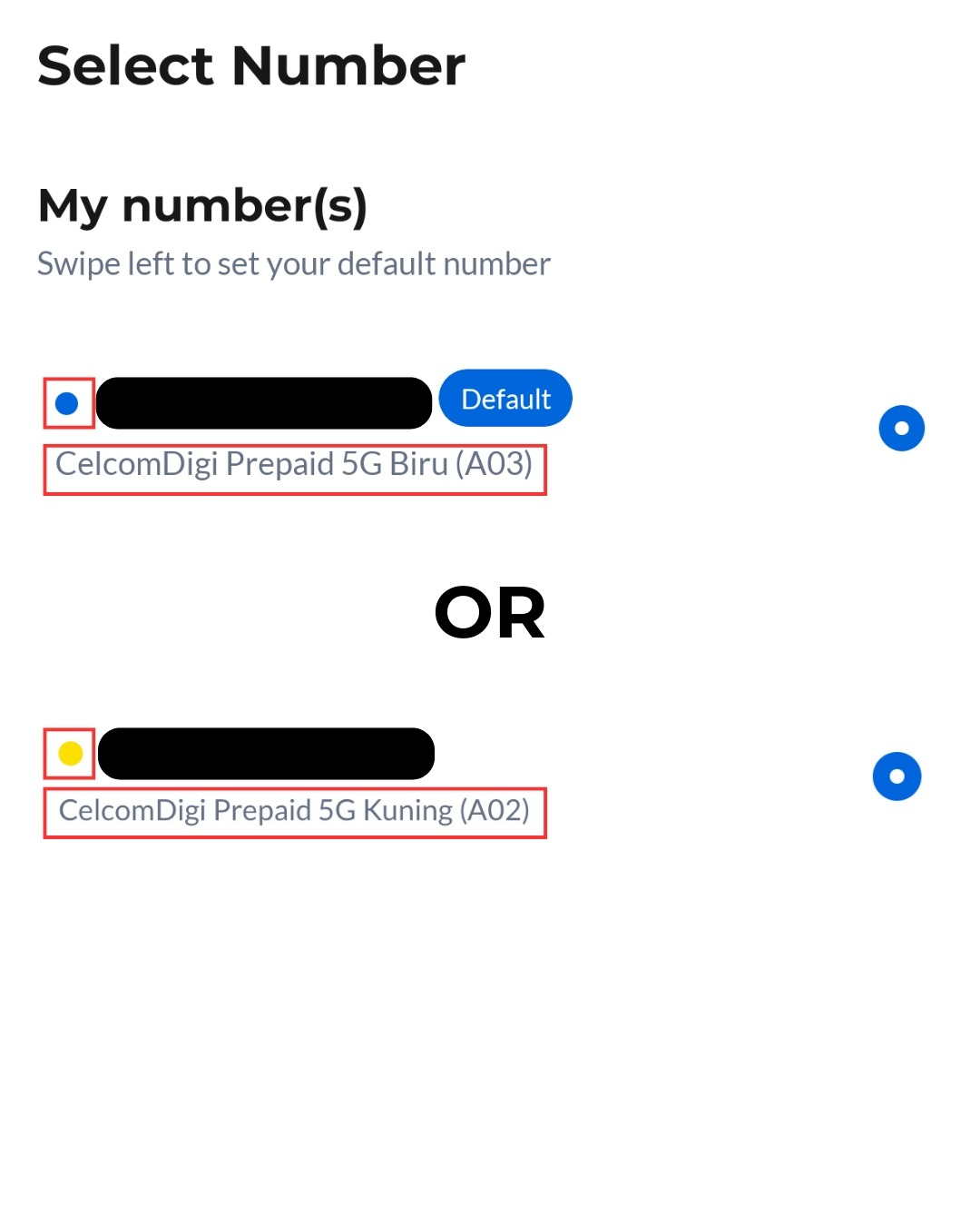 Step 2: Your plan name will appear here. If it shows 'Edisi Biru', you are on the Celcom system. If it shows 'Edisi Kuning', you are on the Digi system. A coloured dot next to your number will also indicate your account system: blue for Celcom and yellow for Digi.