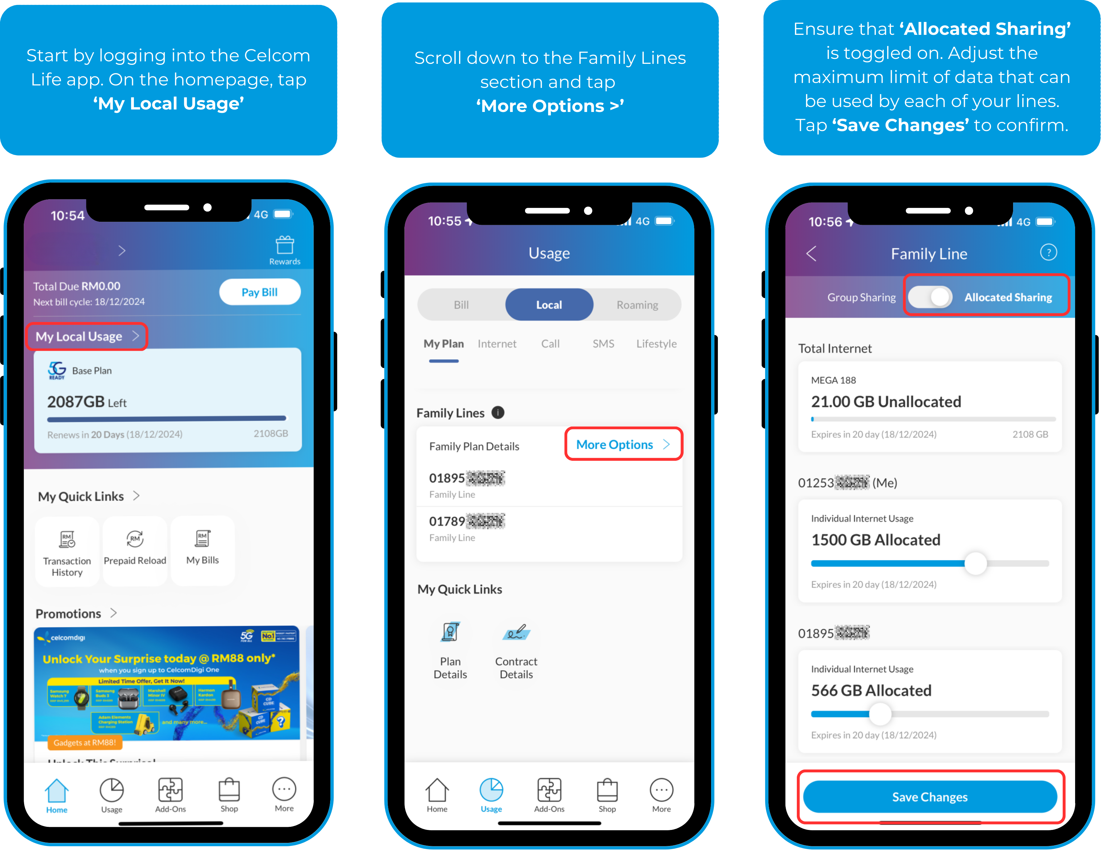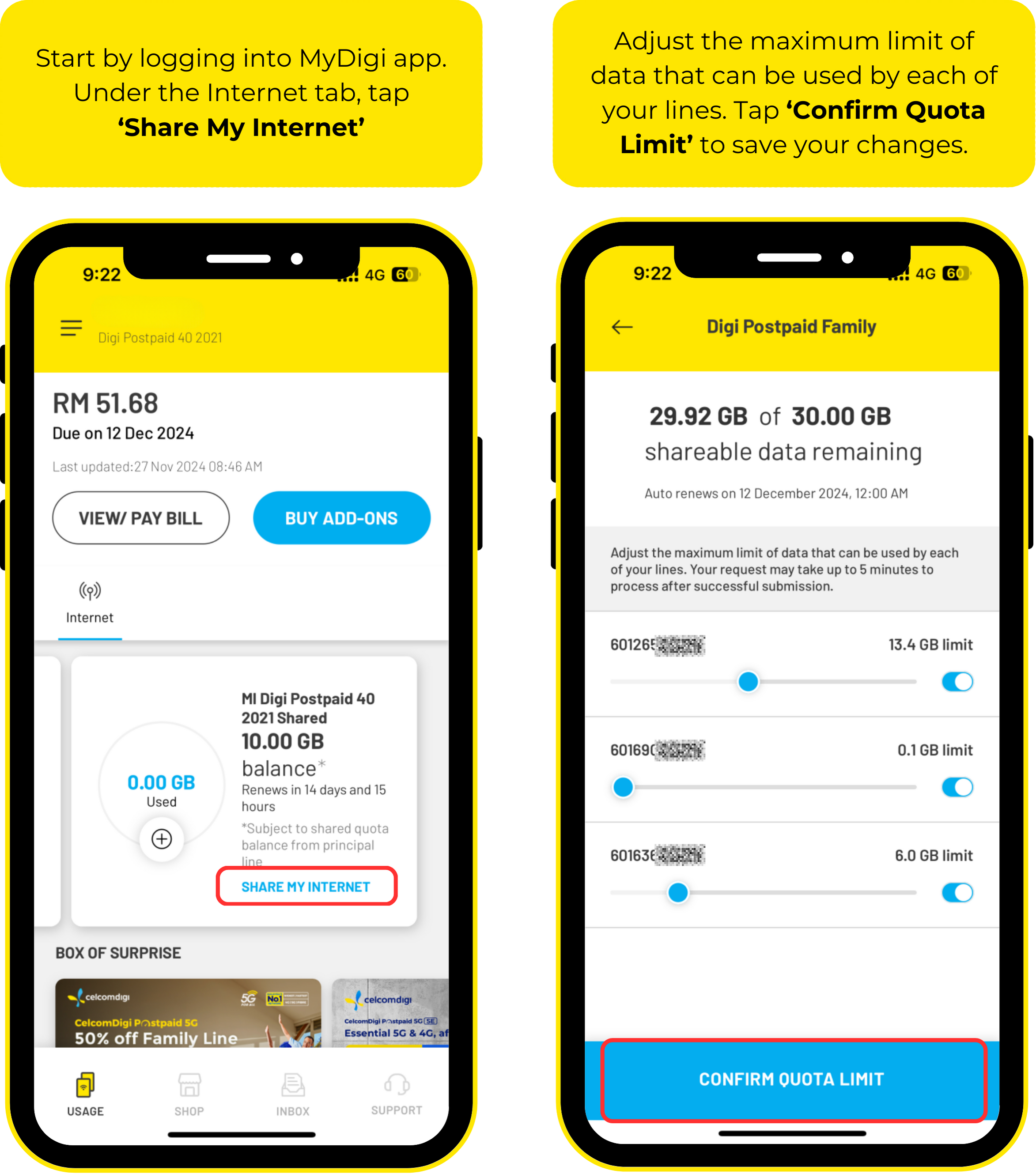 As the principal line owner, you can manage and allocate a specific amount of Internet quota for each of your supplementary lines. Please note that only the principal line owner can share the Internet, and additional charges may apply depending on your subscription plan. Refer to the table below for details on the charges and eligible plans for Internet sharing: