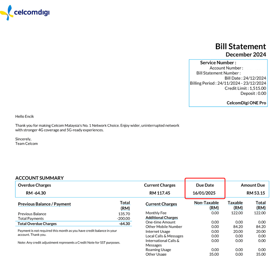 To check your exact bill due date, open the CelcomDigi app and tap on 'Check Bill' to download your bill statement. Your bill due date information should be on the first page of your bill, under 'Account Summary'.
