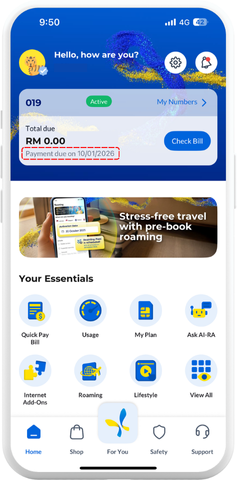 The issuance of your bill statement depends on when you first activate your postpaid line. You will be assigned a bill cycle date closest to your Postpaid line activation. You can check your bill due date by downloading your bill via the CelcomDigi app.