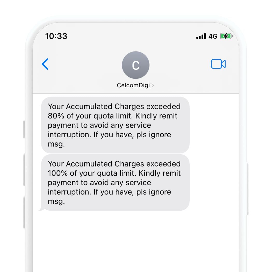 2. Prior to barring, you will receive a few SMS reminders from CelcomDigi to pay your bills. If you haven't paid your bills by then, please do so immediately to avoid service interruptions. The screenshots below show some of the SMS reminders you will receive: