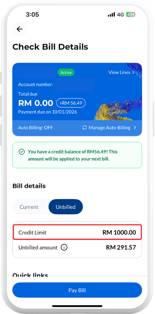 3. Find out your credit limit via the CelcomDigi app. Keep track of your purchases to avoid reaching your credit limit unexpectedly. Open your CelcomDigi app > tap Check Bill > Under Bill details, tap on Unbilled.
