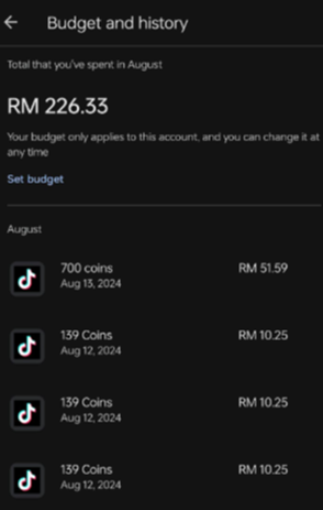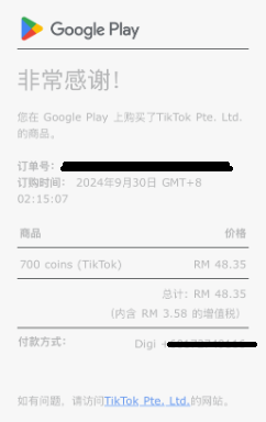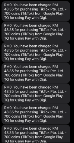 A new modus operandi has been discovered, involving TikTok Coins purchased by scammers after a customer's Gmail account was compromised. These charges are subsequently reflected in the CelcomDigi bill. Customers typically become aware of the issue upon receiving SMS or email notifications of the transaction, or when the charges appear on their bill statement.
