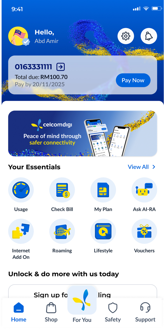 Step 1: On your CelcomDigi app homepage, tap on the '+' icon beside your mobile number. | ![]() |