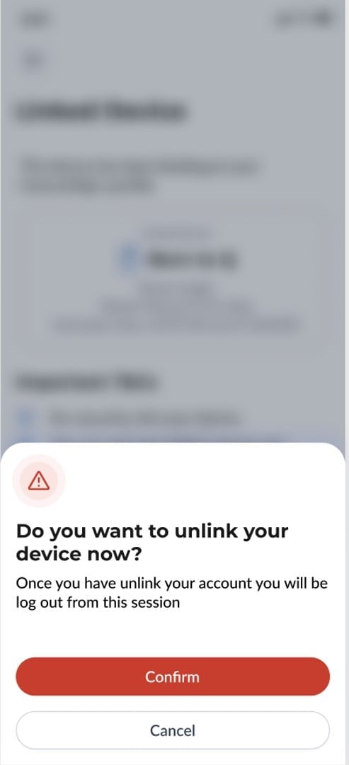 Step 3: To unlink successfully, select ‘Confirm’ on the confirmation prompt and complete biometric verification. After successful biometric verification, you’ll be redirected to the login screen. You can now log in using a different device. | ![]() |