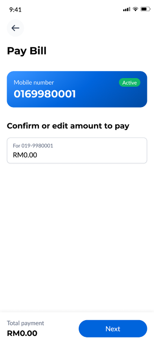 Step 1: On your CelcomDigi app homepage, you can click on ‘Pay Now’, or click on 'View All’ option under Your Essentials section and select ‘Pay Bill for Myself’. | ![]() |