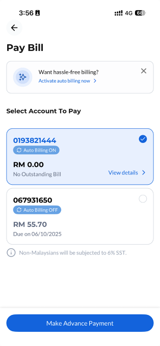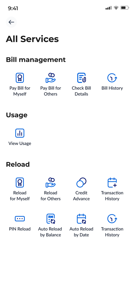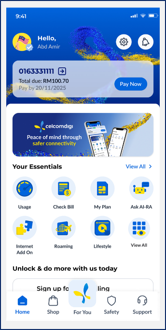 Step 1: On your CelcomDigi app homepage, check under Your Essentials section and select ‘Quick Pay Bill’. | ![]() |