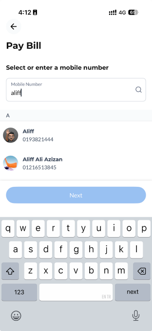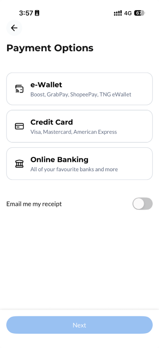 Step 3: Select your preferred payment method. Toggle to receive your payment receipt. Then, click ‘Next’ to complete your bill payment. | ![]() |