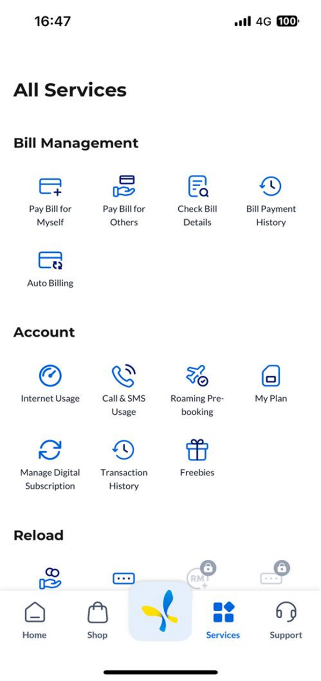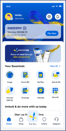 Step 1: On your CelcomDigi app homepage, click on ‘Roaming’. | ![]() |