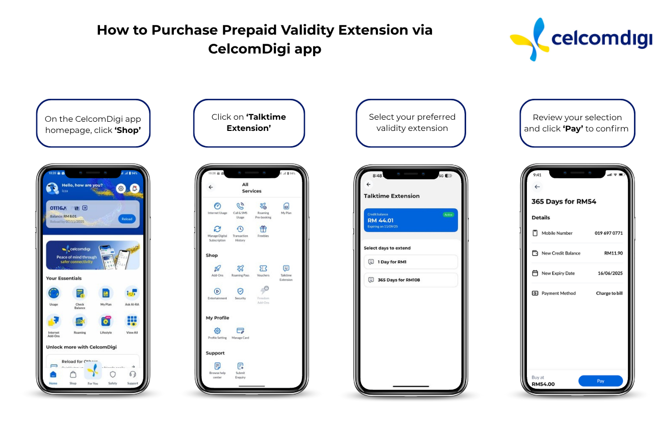 Your credit validity starts from the day you reload successfully and you can have up to RM1,000 credit or reload balance in your account.