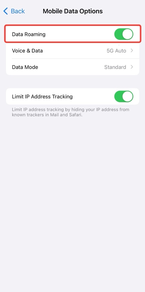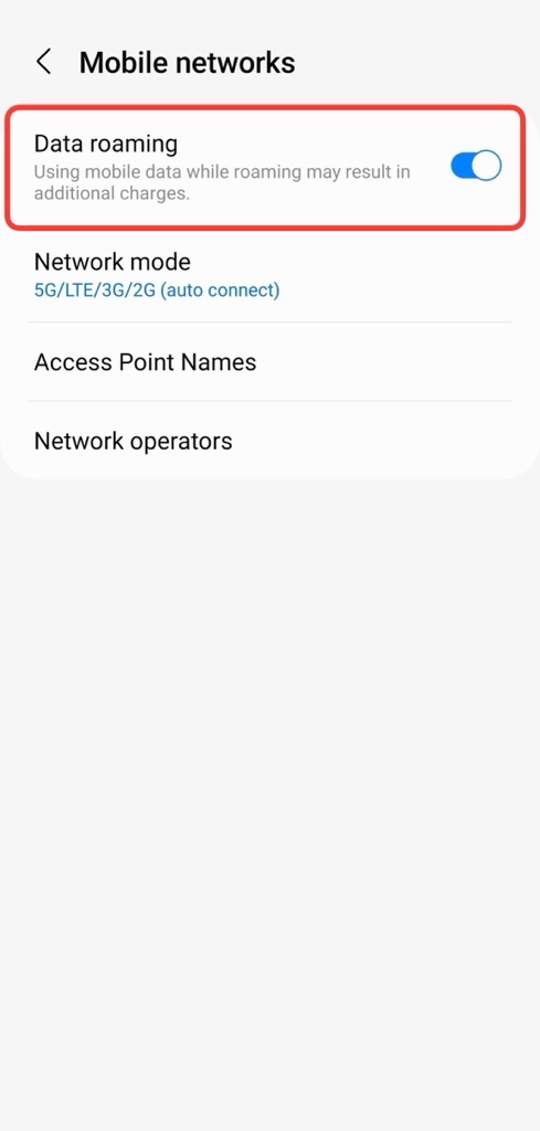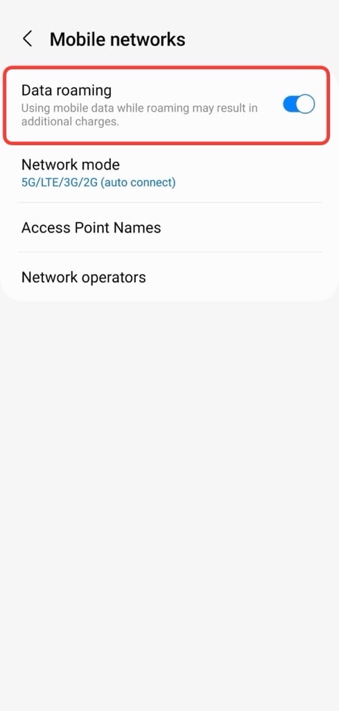 Langkah 3: Hidupkan atau matikan 'Data Roaming' dengan mengalihkan togol