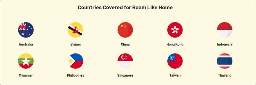 Roam Like Home ialah pakej berulang bulanan, dengan bayaran bulanan tetap yang memberikan pelanggan perantauan Internet, panggilan suara dan/atau IDD di 10 negara:
