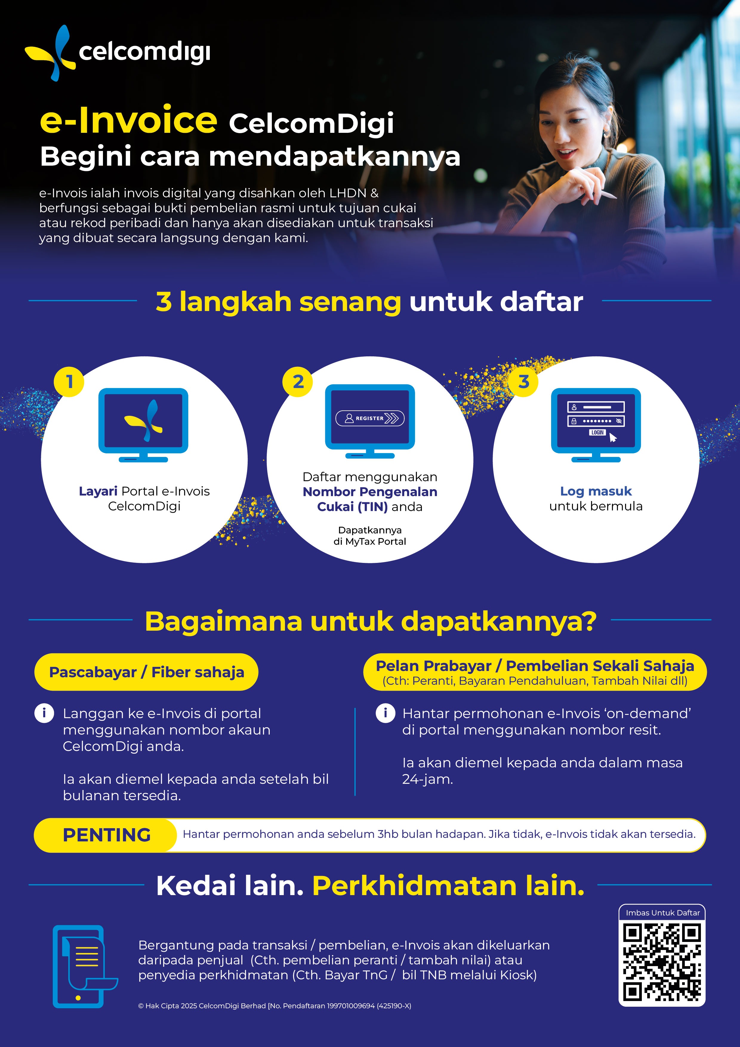 Bagi pengguna CelcomDigi, anda boleh mula memohon e-Invois melalui portal e-Invois kami mulai 1 Julai 2025.