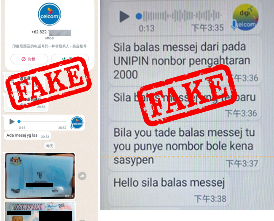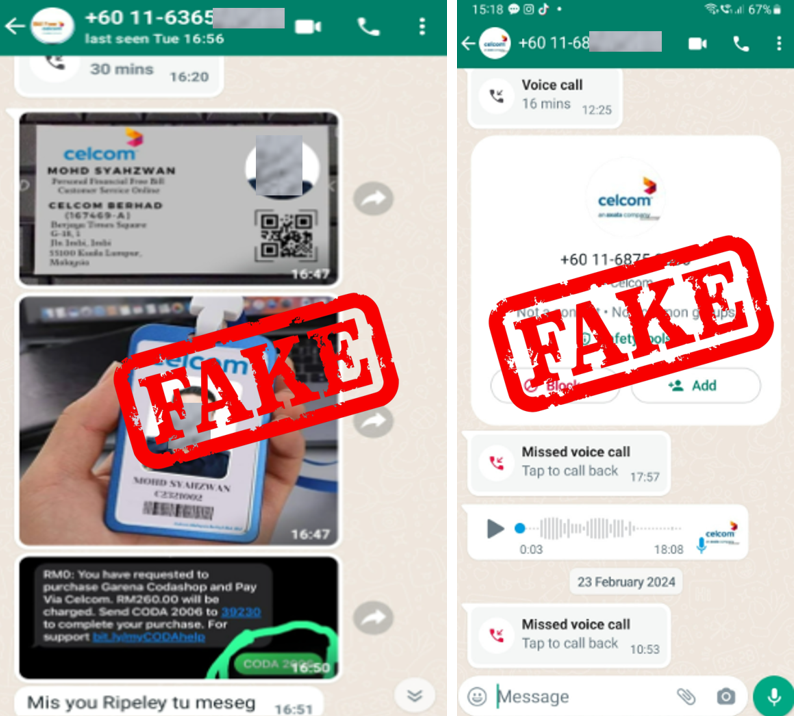 Kami ingin memaklumkan bahawa terdapat laporan mengenai scammer yang menyamar sebagai wakil jualan CelcomDigi. Mereka akan menghubungi pelanggan Celcom atau Digi melalui panggilan telefon atau panggilan WhatsApp untuk menawarkan tawaran menarik seperti bil percuma atau penghapusan bil pascabayar selama 3 bulan. Wakil jualan palsu CelcomDigi akan meminta anda untuk kongsikan OTP atau membalas SMS untuk mendapatkan tawaran tersebut.