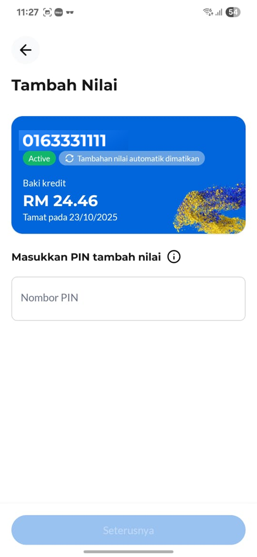 Jika anda ingin tambah nilai menggunakan PIN, ikuti langkah-langkah di bawah: