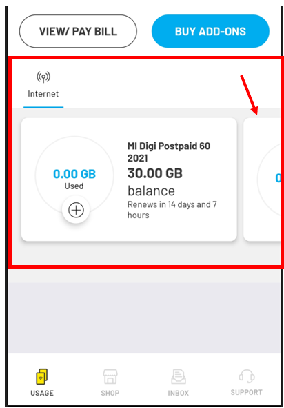 Jika anda telah habis menggunakan kuota Internet anda, anda boleh membeli internet tambahan melalui aplikasi MyDigi (tertakluk kepada kelayakan). | |